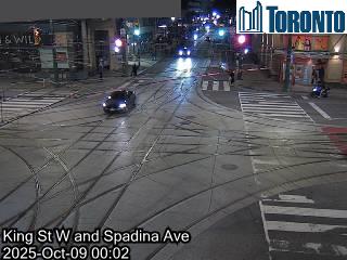 A city of Toronto traffic camera shows a live captured image at the intersection of Spadina Avenue and King Street West.