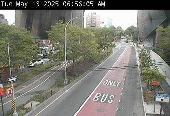 Traffic camera showing the intersection of South Street and Pike Street in Manhattan.The South Street follows the Franklin D. Roosevelt Drive, which is raised.
