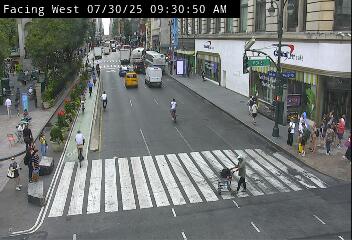 Caméra de circulation montrant la 6e Avenue, près de la 34e Rue à Manhattan.Voyez de l'autre coté du terre plein le l'axe Broadway et sur le coin de la rue le gros complexe commercial Herald Center (STAPLES, DAFFY'S et ASA).